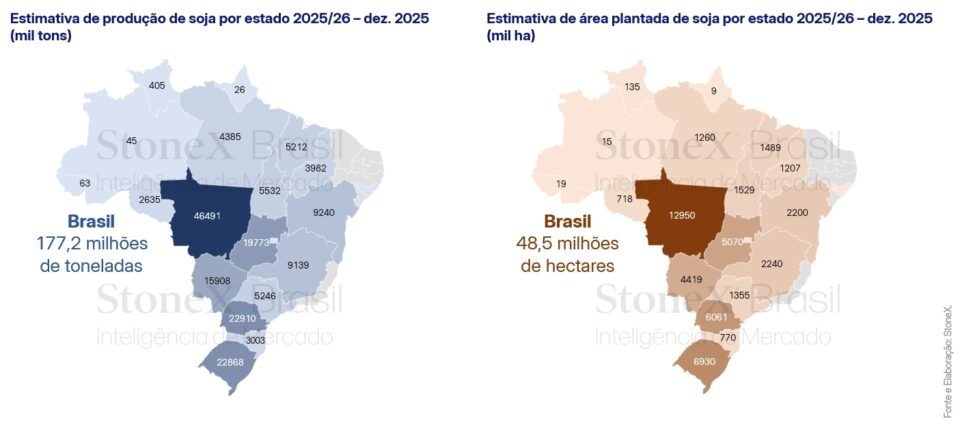 Em sua revisão mensal, a StoneX, empresa global de serviços financeiros, apresentou novos dados para a safra de soja 2025/26. Na atualização de dezembro, a consultoria ajustou para baixo a estimativa de produção nacional, agora projetada em 177,2 milhões de toneladas — ainda um recorde histórico, porém 0,9% inferior ao previsto no relatório anterior.